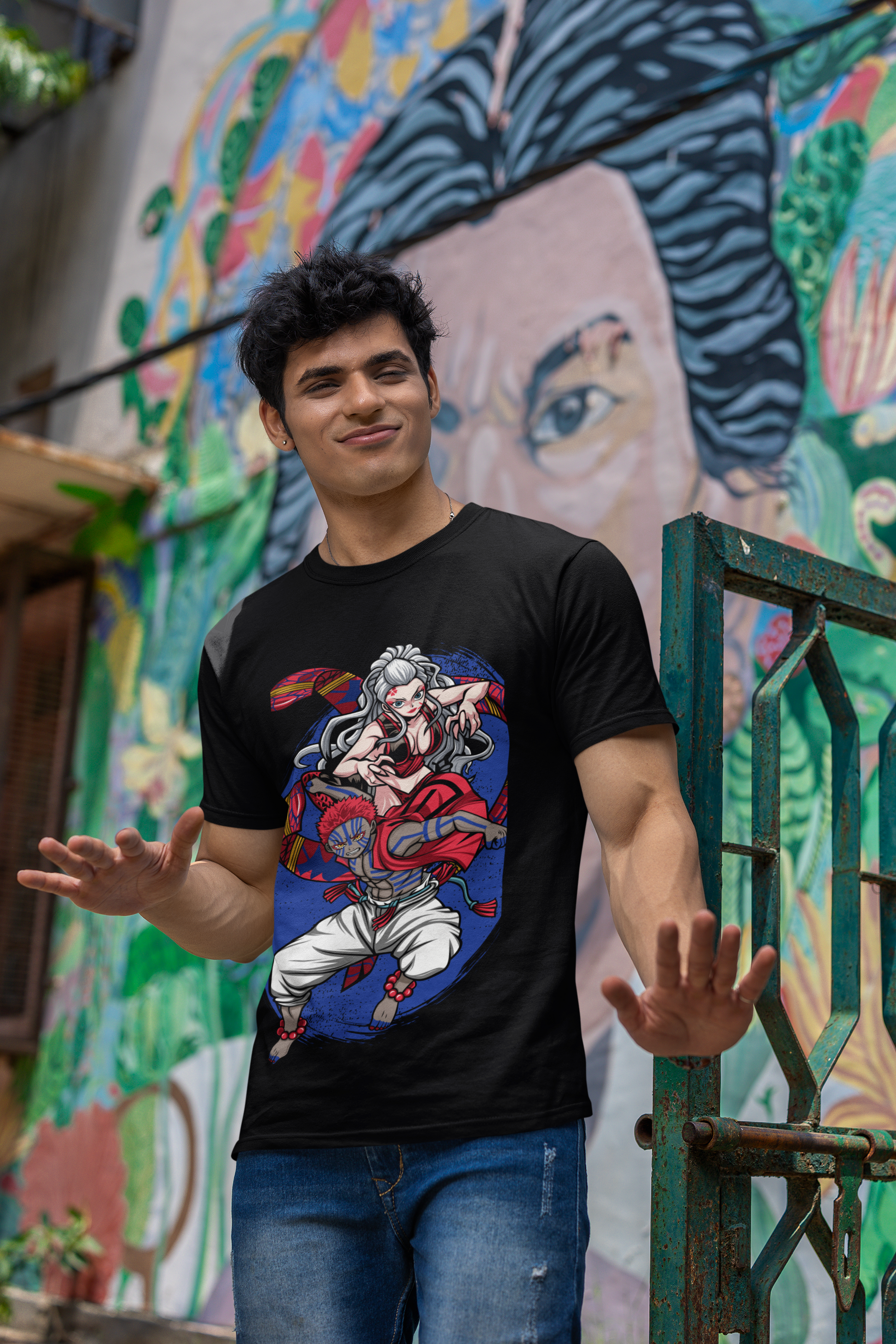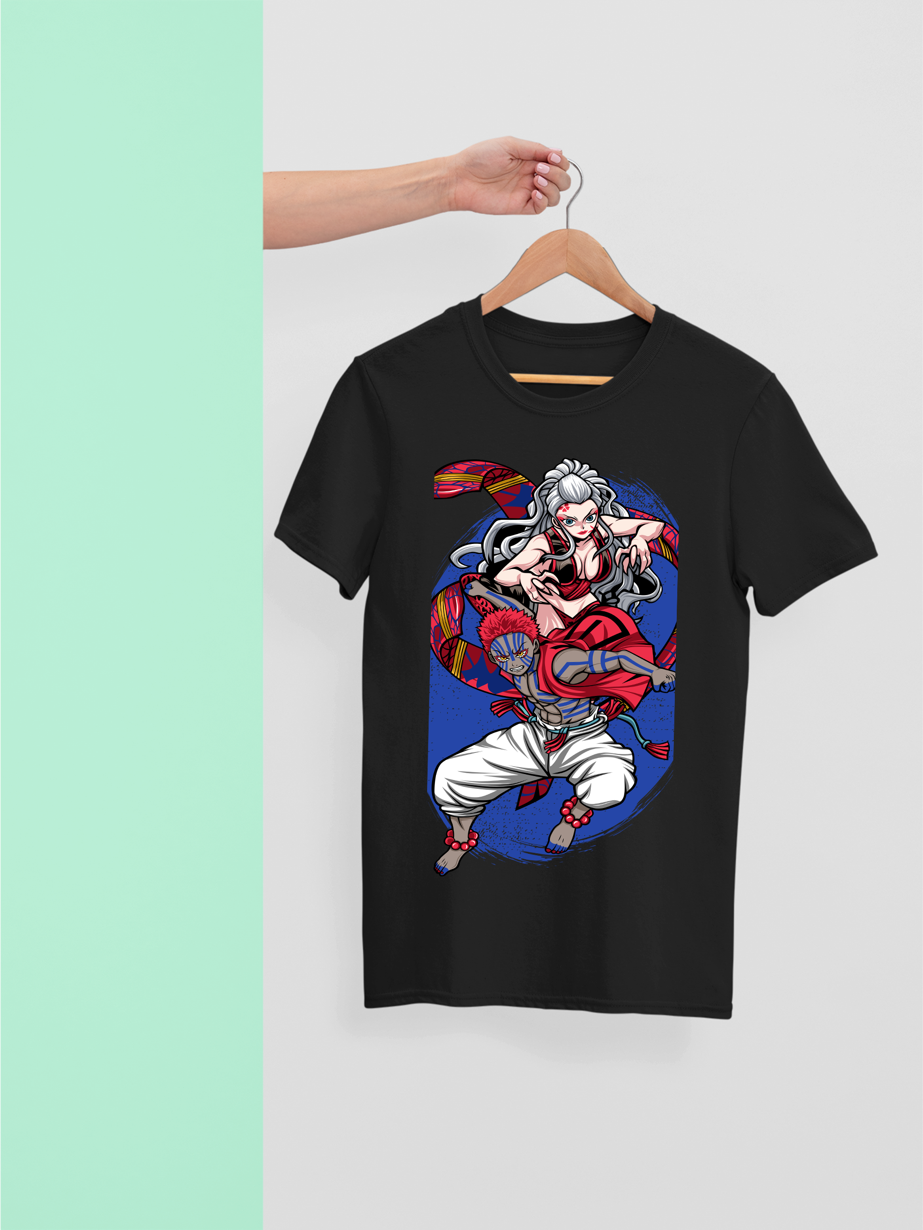 This intense artwork captures the deadly elegance of Daki and the raw ferocity of Akaza, two formidable Upper Rank demons from Demon Slayer. With Daki’s sashes spiraling in crimson and Akaza’s muscular stance marked by blue stripes, they dominate the scene against a vibrant blue backdrop. Their combined presence radiates power, danger, and dark allure.