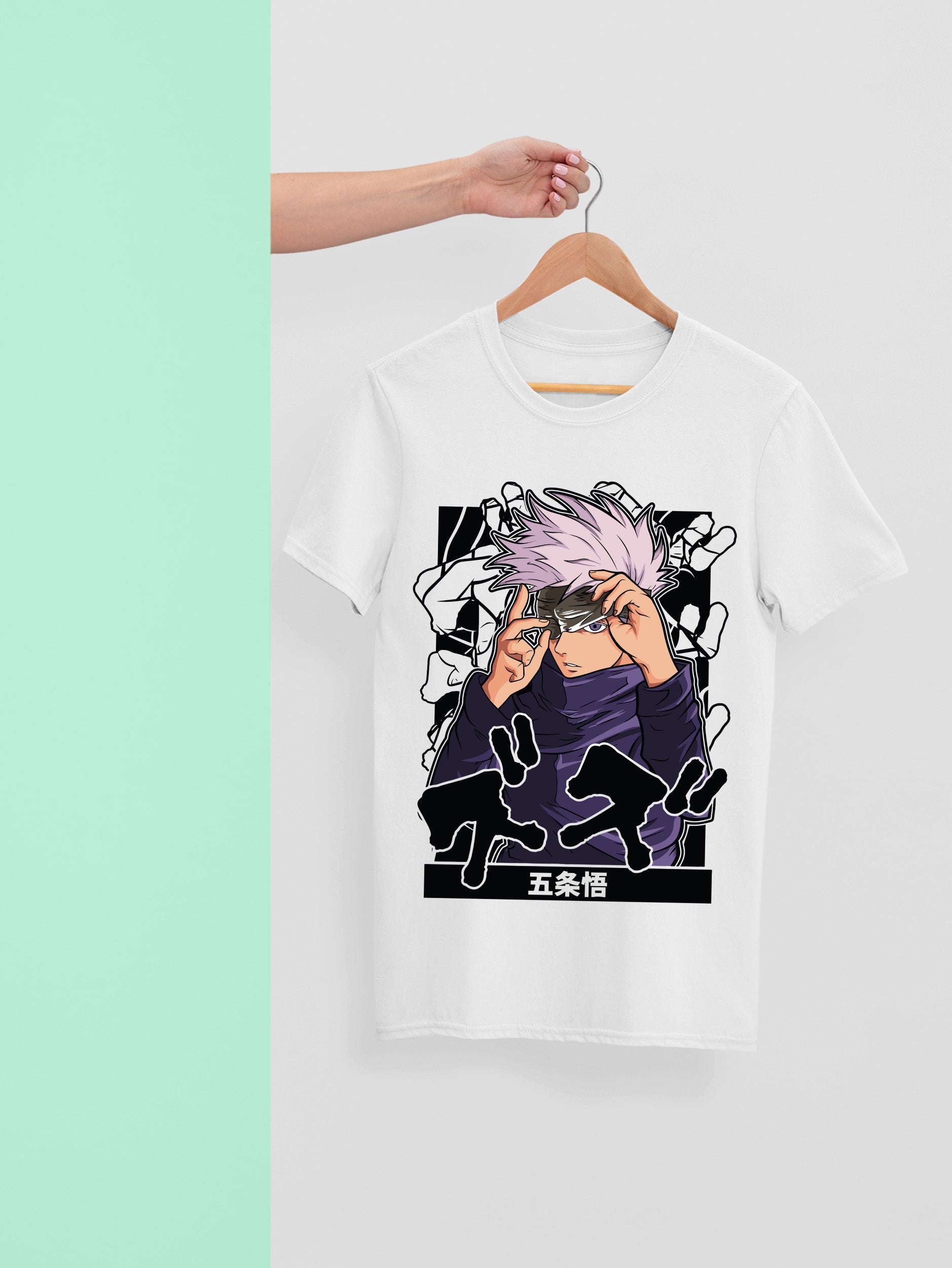 This bold illustration of Gojo Satoru highlights his iconic moment of lifting the blindfold, revealing the immense power of his Six Eyes. With his lavender hair flaring and a determined gaze, Gojo stands against a striking black-and-white backdrop of mirrored hand signs. The large Japanese lettering adds dynamic contrast, making this design a fierce tribute to Jujutsu Kaisen’s strongest sorcerer.