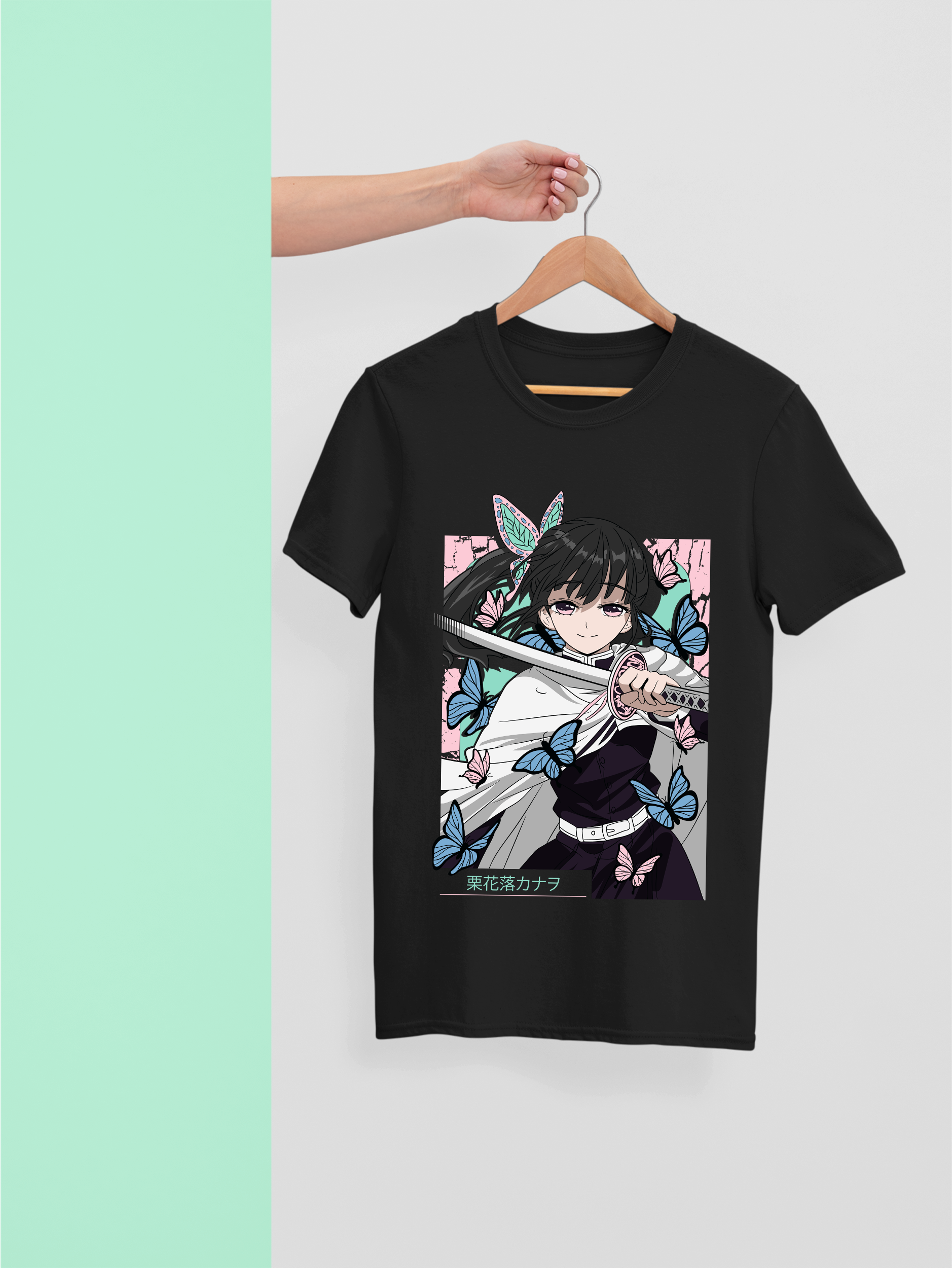 An elegant illustration of Kanao Tsuyuri from Demon Slayer, beautifully framed by pastel butterflies and a cracked backdrop of soft hues. Her poised stance with the Nichirin sword and butterfly hair clip symbolizes her inner calm and strength. This design is ideal for apparel, wall prints, or collectors who admire Kanao’s quiet determination.