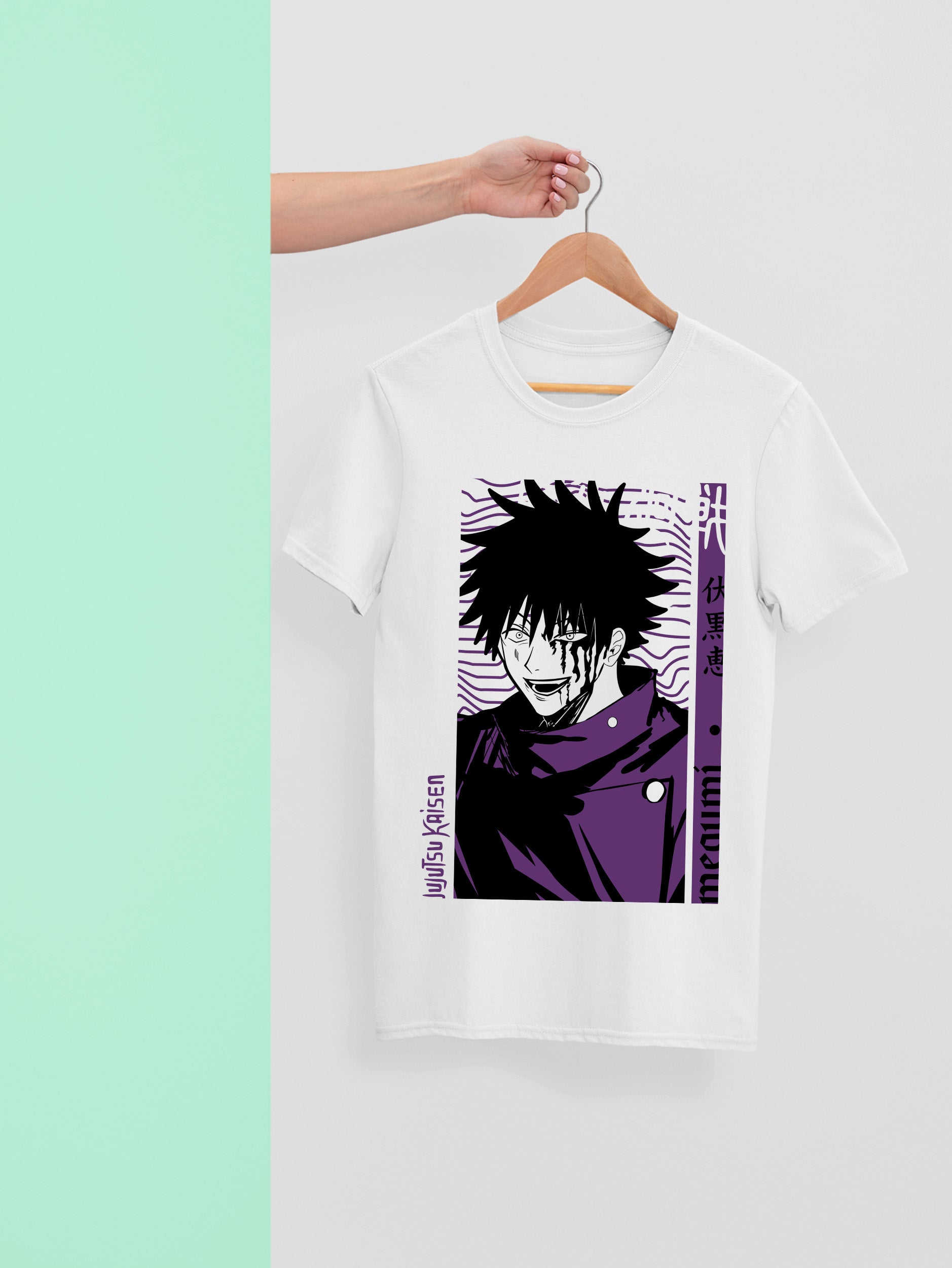 This striking design captures Megumi Fushiguro in his domain expansion form, engulfed in deep violet tones and chaotic cursed energy. With shadows curling around him and a manic expression breaking through, the piece evokes the dark potential lurking beneath his composed exterior. Stylized wave lines and kanji add to the mystique, making this a bold tribute to his unleashed power in Jujutsu Kaisen.