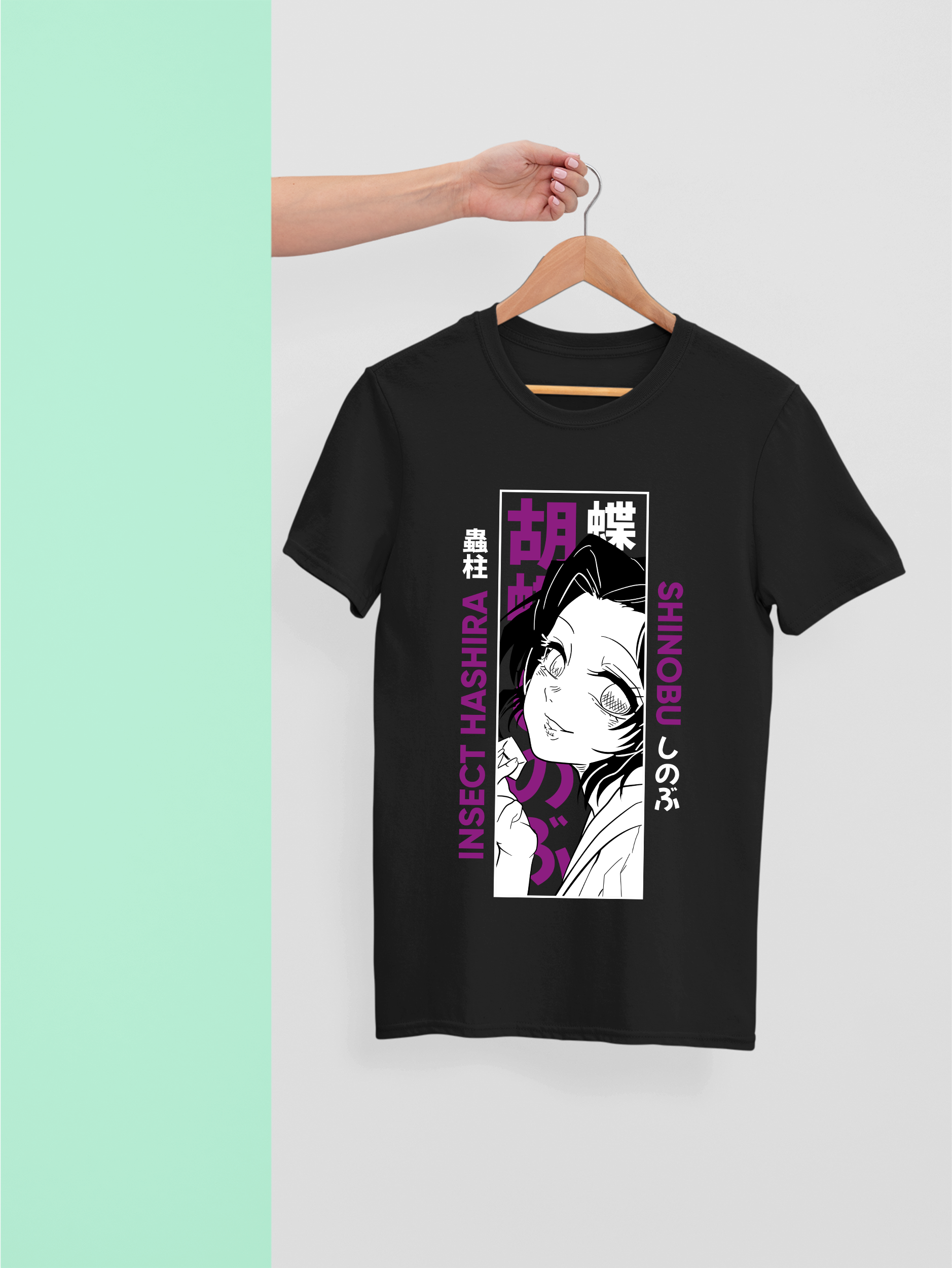 Step into the calm but deadly world of Shinobu Kocho, the Insect Hashira. This monochrome manga-style design highlights her composed yet piercing gaze, with bold Japanese and English text framing her signature style. A must-have for fans who admire her elegance, intelligence, and silent strength.
