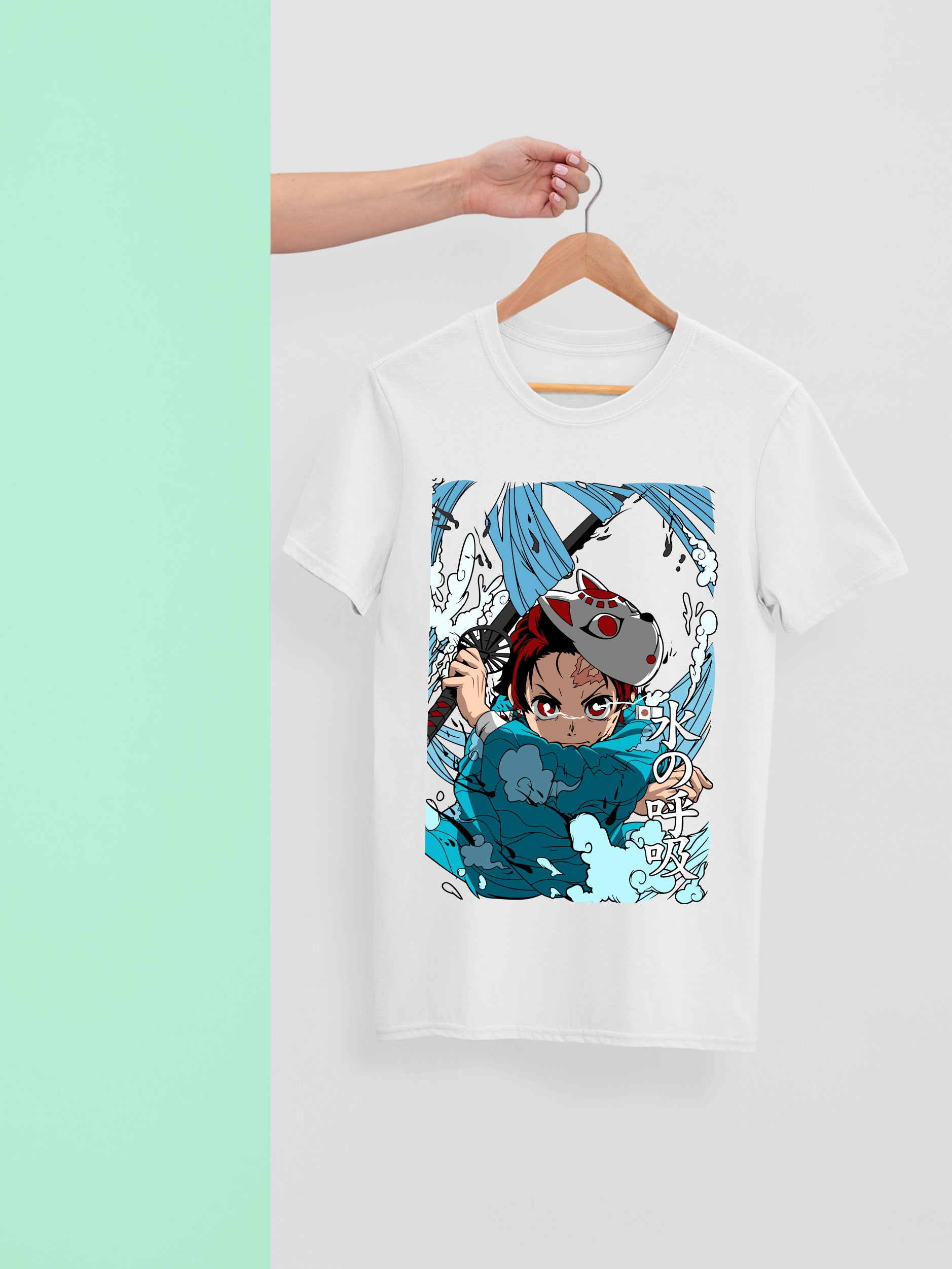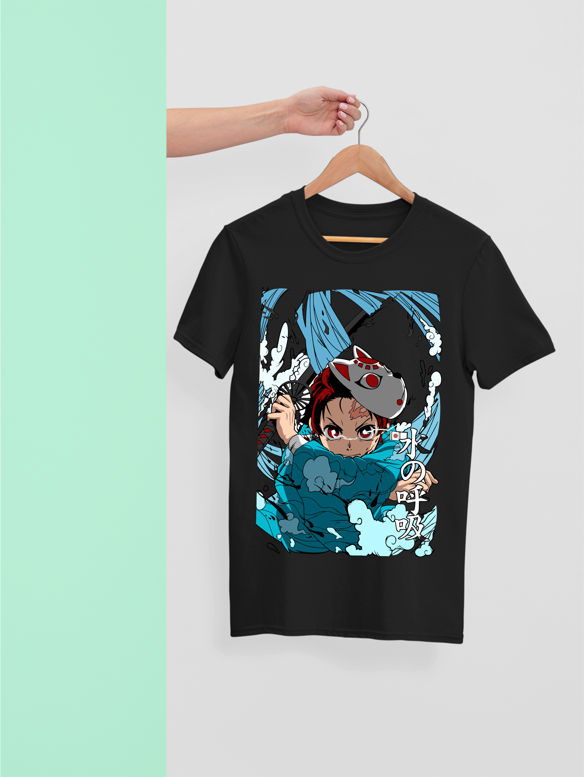 This powerful design captures Tanjiro in mid-strike, channeling the serene yet deadly force of Water Breathing. With his signature hanafuda earrings, fox mask tilted, and eyes locked in fierce concentration, waves crash and curl around him in a dynamic swirl of blues and whites. The vertical kanji reads “Breath of Water,” perfectly reflecting his fluid fighting style and unwavering resolve.