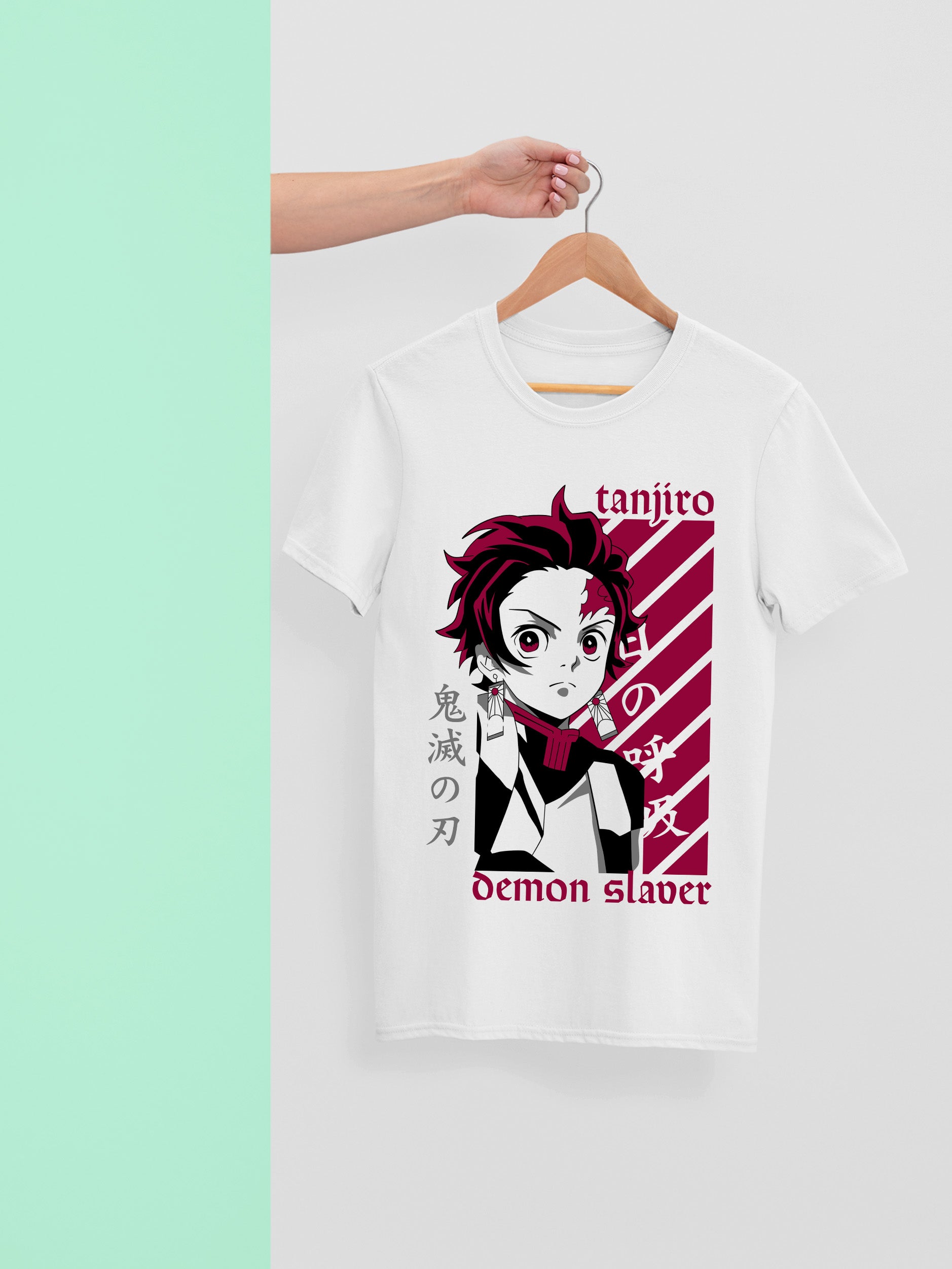 A bold and minimalist design featuring Tanjiro Kamado in a powerful stance, set against deep crimson and black tones. His Hanafuda earrings and distinct forehead mark stand out with fierce determination, while diagonal stripes and elegant Japanese text frame his presence. This design embodies Tanjiro's unwavering heart and his fight to protect and redeem.