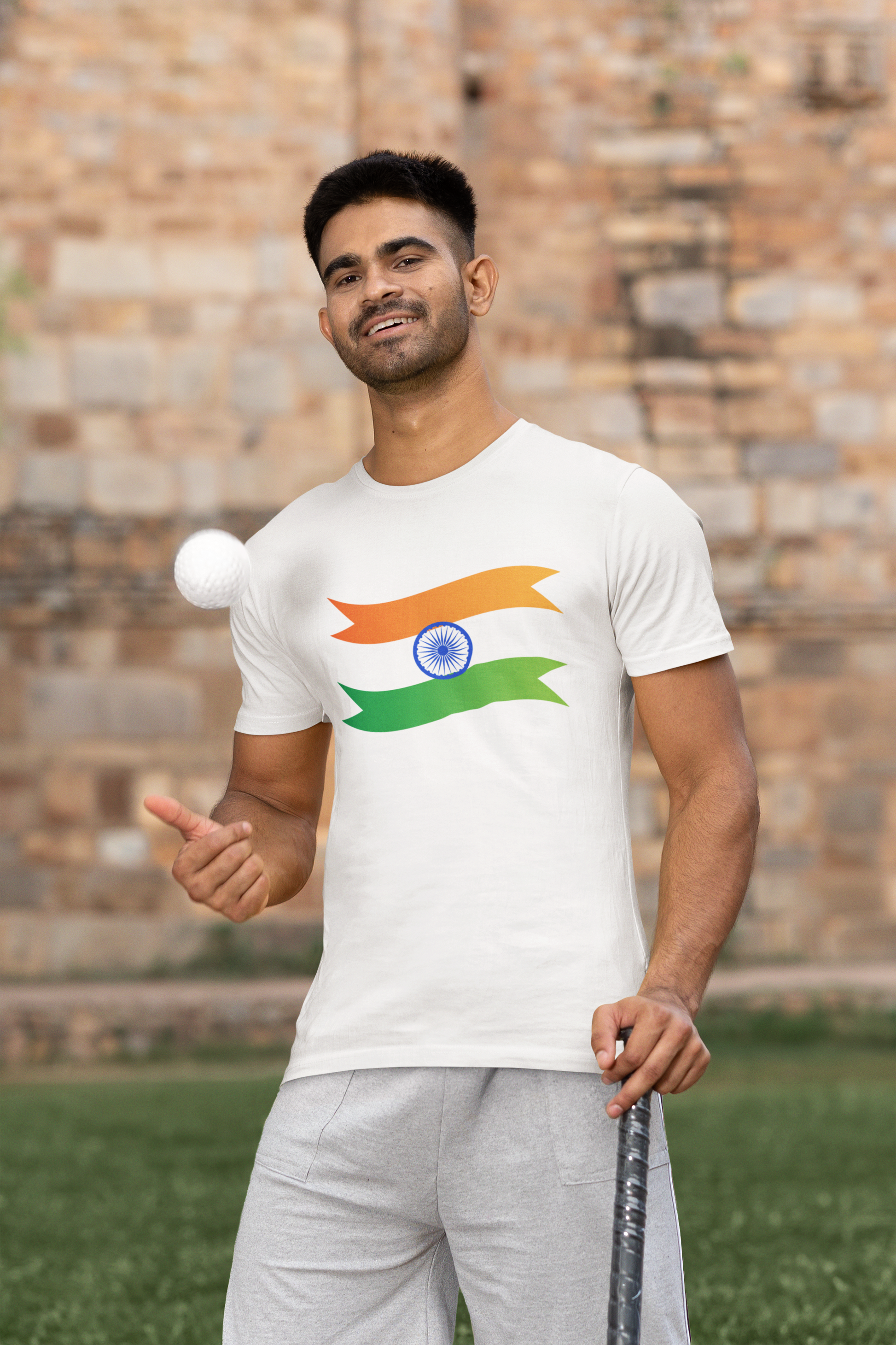 This unique T-shirt features a stylish ribbon design in saffron and green, beautifully wrapping around the iconic Ashoka Chakra.