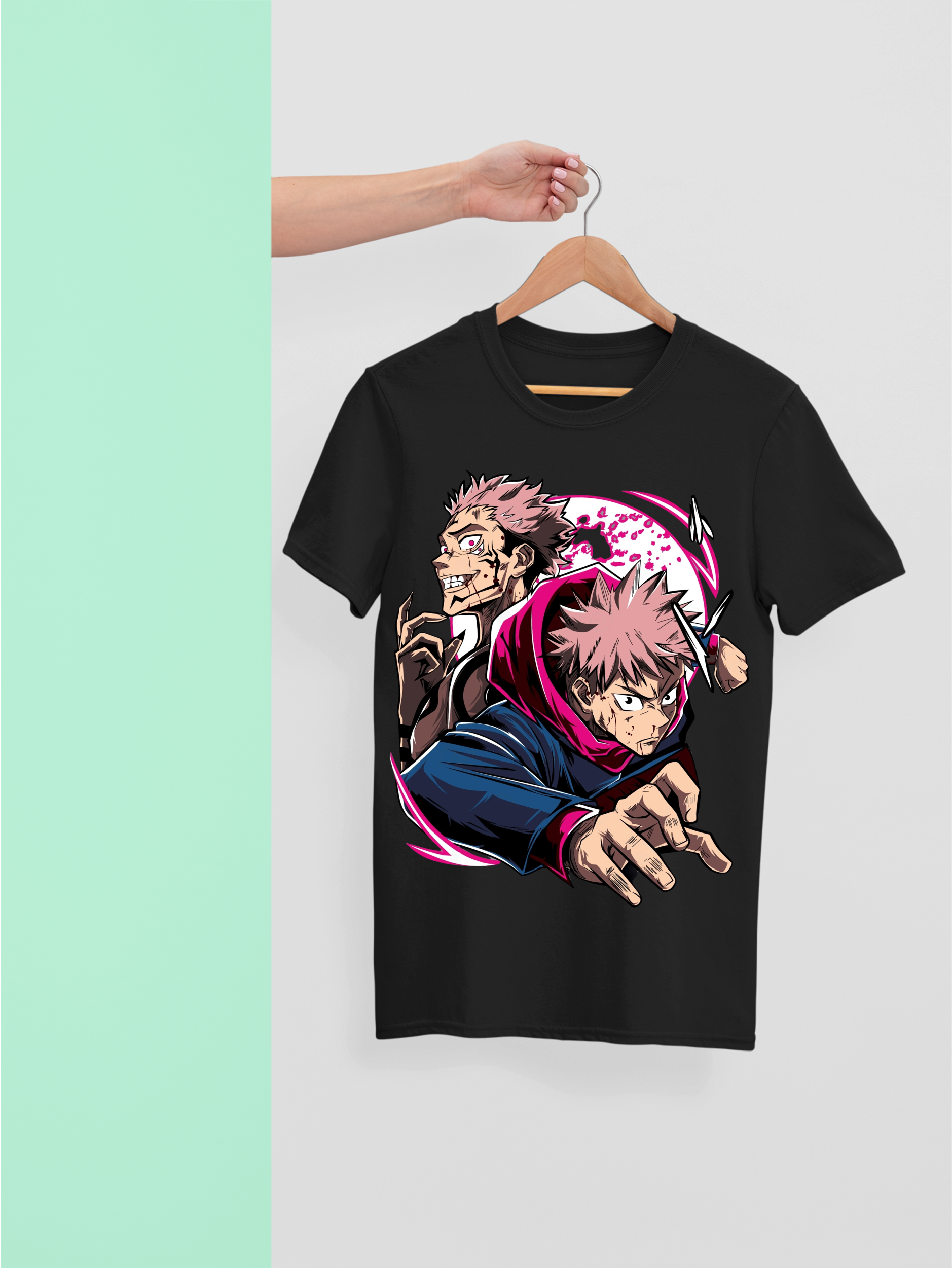 Yuji Itadori and Ryomen Sukuna — two souls locked in one fate. This design captures the explosive clash between control and chaos. From Yuji’s focused strike to Sukuna’s sinister grin, it’s a perfect tribute to the inner war that defines Jujutsu Kaisen.